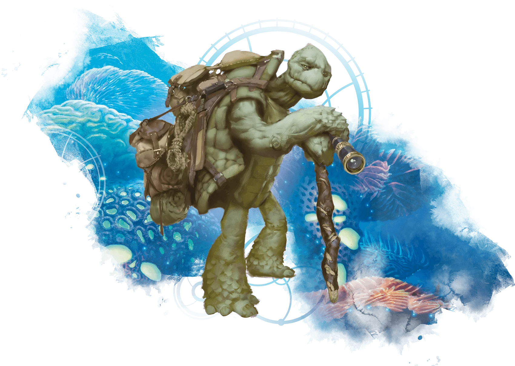 Tortles have a saying: “We wear our homes on our backs.” These turtle folk live on many worlds, most often journeying up and down coasts, along waterways, and across the sea. Tortles don’t have a unified story of how they were created, but they all have a sense of being mystically connected to the natural world. Carrying their shelter on their backs gives tortles a special feeling of security wherever they go, for even if they visit a far, unknown country, they have a place to lay their heads.