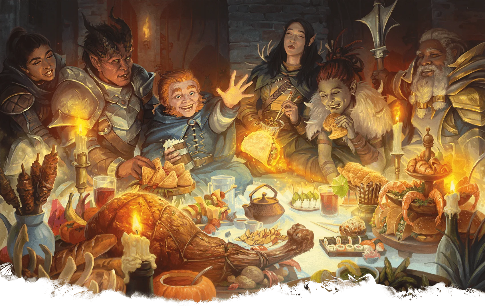 You conjure a feast that appears on a surface in an unoccupied 10-foot Cube next to you. The feast takes 1 hour to consume and disappears at the end of that time, and the beneficial effects don’t set in until this hour is over. Up to twelve creatures can partake of the feast.